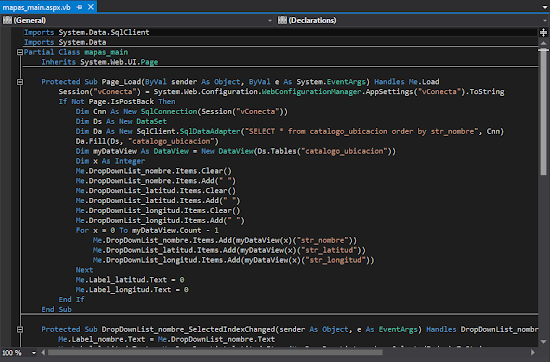 Crearemos la WebForm mapas_main.aspx que será llamada para visualizar en un DropDownList las ubicaciones grabadas en mapas.catalogo.aspx.