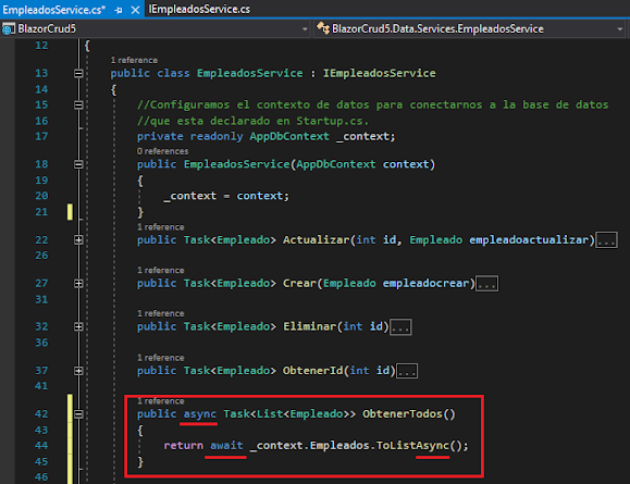 Por ahora solo utilizaremos el método ObtenerTodos, enviaremos todos los registros de la tabla Empleados a una lista con ToList, pero como es mejor realizar las llamadas asíncronas agregamos Async al final, Async al Task y un await en el return.