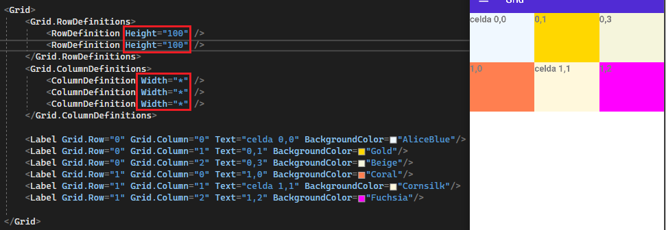 Dentro del código crearemos un GRID, donde especificaremos los renglones y columnas, indicamos que nuestro Grid tendra 2 renglones y 3 columnas con un ancho de 100.
